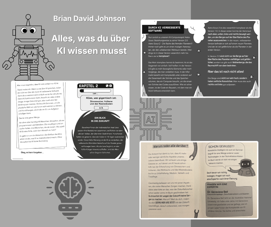 „Was ist eigentlich Künstliche Intelligenz? Wird sie die Welt erobern? Und wird sie eines Tages unsere Zimmer aufräumen …? In diesem Leitfaden für Einsteiger erfährst du alles, was du über KI wissen musst – wie sie uns hilft, unglaubliche Dinge im Weltraum oder tief unten im Meer zu entdecken, bis hin zu der Frage, wie du mit ihrer Hilfe deinen eigenen Dinosaurier bauen kannst. Brian David Johnson erklärt, was KI ist, woher sie kommt, auf welch unglaubliche Weise sie heute eingesetzt wird und wie sie unsere Zukunft prägen und neu gestalten könnte. Vollgestopft mit erstaunlichen Fakten, Mythen und Erkenntnissen von Experten aus aller Welt, für neugierige Kinder und verwirrte Erwachsene!“ (Produktbeschreibung)