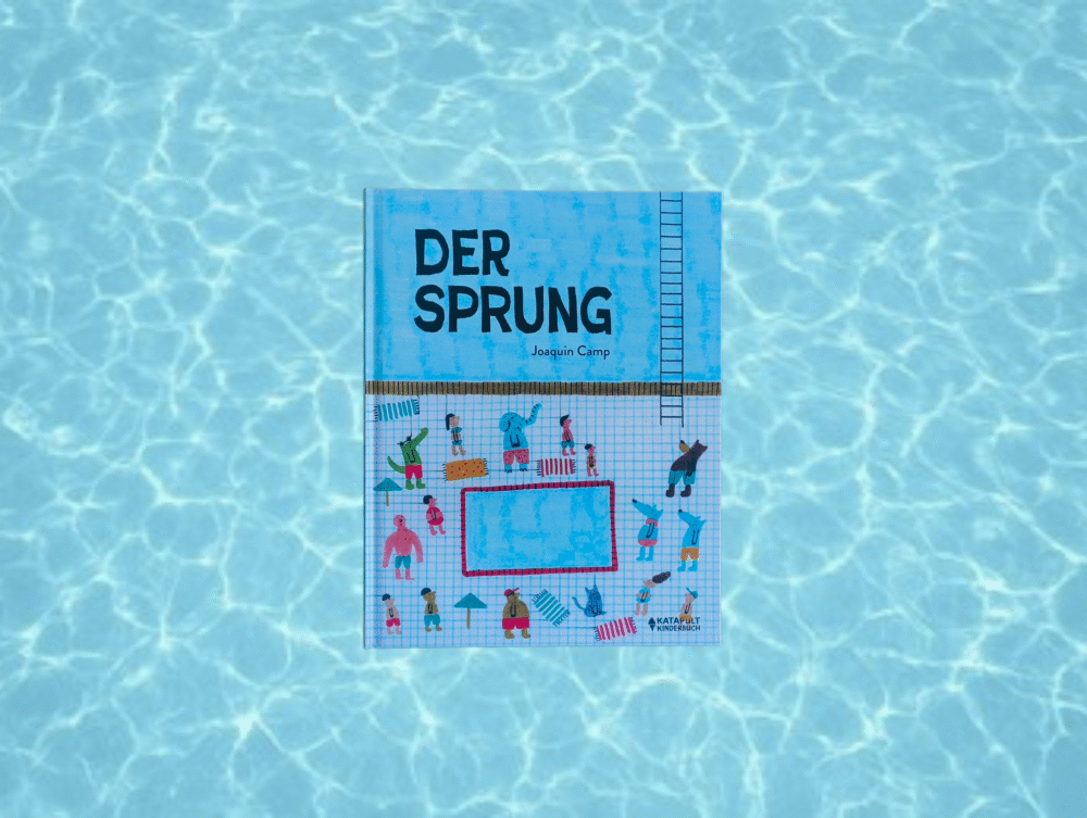 „Ins Wasser zu springen ist doch echt ne Kleinigkeit, oder? Falsch! Wenn man am Ende eines Sprungbretts steht, wird es zu einer furchteinflößenden Herausforderung … Wird unser Held den Mut finden, den Sprung zu wagen? Ein urkomisches Bilderbuch für alle, die schon einmal voller Angst wie angewurzelt am Beckenrand standen.“ (Produktbeschreibung)