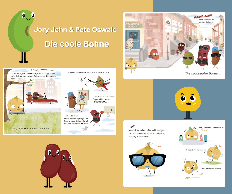 In der Geschichte geht es um die „coolen Bohnen“ in der Schule – Bohnen, die jeder kennt und bewundert. Früher gehörte unsere kleine Bohne noch ganz selbstverständlich dazu, doch mit der Zeit verändert sich etwas: Die anderen wirken immer lässiger und souveräner, während sie sich selbst zunehmend unbeholfen und uncool fühlt. Die innere Kritik wird lauter und das Gefühl, nicht mehr dazuzugehören, immer stärker. Also versucht sie alles, um endlich auch wieder cool zu sein – doch nichts klappt so richtig und das Selbstvertrauen sinkt immer weiter. Besonders schön finde ich dabei, wie die Geschichte die Perspektive kippt: Als die kleine Bohne einen richtig miesen Tag erwischt, sind es ausgerechnet die „Coolen“, die helfen – ganz selbstverständlich und in verschiedenen Alltagssituationen. Der Wendepunkt zeigt eindrucksvoll, dass Coolness nichts mit Überheblichkeit zu tun hat. Durch die Unterstützung gewinnt die kleine Bohne neuen Mut und fühlt sich wieder als Teil der Gruppe. Dadurch entsteht ein starker Aha-Moment: Vielleicht bedeutet cool sein gar nicht, perfekt auszusehen oder bewundert zu werden – vielleicht ist es viel cooler, freundlich zu sein, anderen beizustehen und niemanden stehen zu lassen.