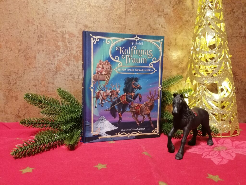 Kolfinnas Traum – Ein Pony vor dem Weihnachtsschlitten von Lilja Hindahl ist mir durch das zauberhafte Cover auf der Frankfurter Buchmesse ins Auge fallen. Eigentlich wollte ich es schon etwas früher empfehlen, damit ihr es euch gleich zu Beginn der Weihnachtszeit zulegen könnt, aber das Leben läuft eben nicht immer so, wie man es plant. Aber heute – zum 1. Advent – ist ja auch ein schöner Zeitpunkt, dieses Buch näher vorzustellen und euch ans Herz zu legen. Es beinhaltet eine wunderschöne Geschichte mit viel Tiefgang und das beeindruckende daran, die Autorin ist noch ein recht junges Mädchen von 13 Jahren. Die Geschichte ist dennoch so gut geschrieben und ausgefeilt konzipiert, dass man meinen könnte, die Schriftstellerin hätte schon jahrelange Erfahrung mit dem Schreiben und Veröffentlichen von Büchern. Hut ab!