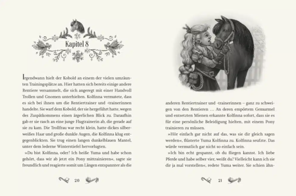 Kolfinnas Traum – Ein Pony vor dem Weihnachtsschlitten ist eine zauberhafte Weihnachtsgeschichte. Ich kann sie euch nur wärmstens ans Herz legen. Mit ihren 22 Kapitel lässt sie sich sogar fast wie ein Adventskalenderbuch lesen und beschert eine wunderschöne Weihnachtszeit. Schnappt euch das Buch, lernt Kolfinnas Welt kennen und erlebt mit ihr ein außergewöhnliches Abenteuer.
