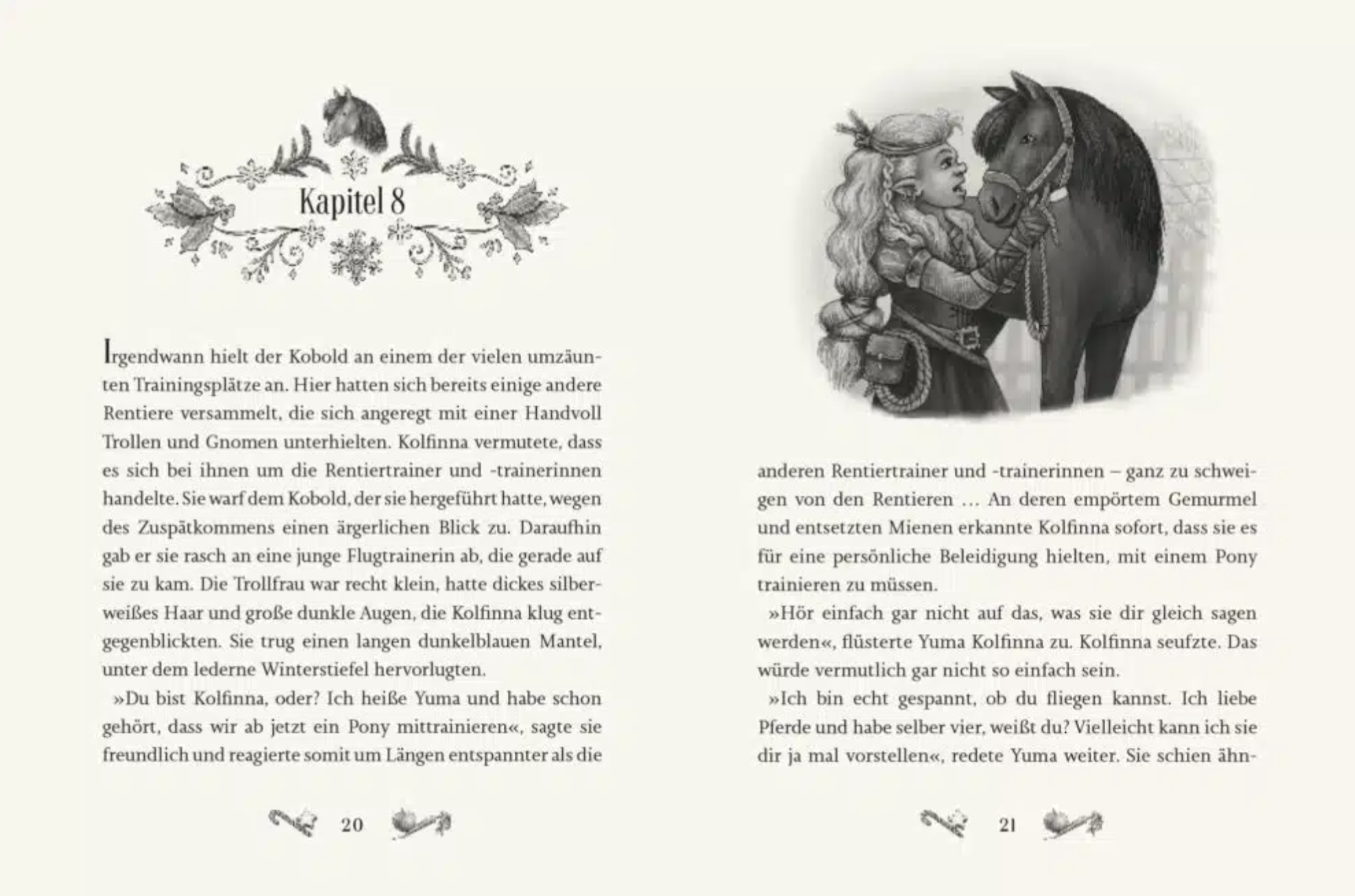 Auch die Zeichnungen im Innern des Buches sind liebevoll und detailreich. Sie sind in Schwarz und Weiß gehalten und sehr plastisch umgesetzt. Die Kapitelüberschriften sind wunderhübsch in Szene gesetzt, um die Seitenzahlen finden sich weihnachtliche Süßigkeiten für Mensch und Tier und auch innerhalb der 22 Kapitel werden Abschnitte durch kleine Illustrationen abgetrennt und erleichtern es dem Leser, festzustellen, wann eine neue Szene beginnt.