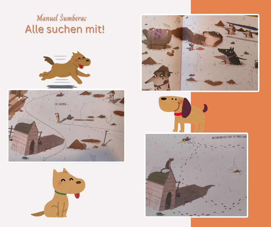 Alle suchen mit! ist ein liebevoll gezeichnetes Bilderbuch über eine große Suche, deren Ausgang dann ganz unverhofft und anders ausfällt. Gesucht wird ein Gegenstand unter der Erde, finden werden die Hunde dann aber etwas viel wichtigeres oberhalb davon. Manuel Šumberac hat hier auf kreative Weise eine witzige Geschichte entworfen, die einen zum Nachdenken bringt und auch ein wenig irritiert oder ratlos – dabei aber absolut positiv – zurücklassen wird.