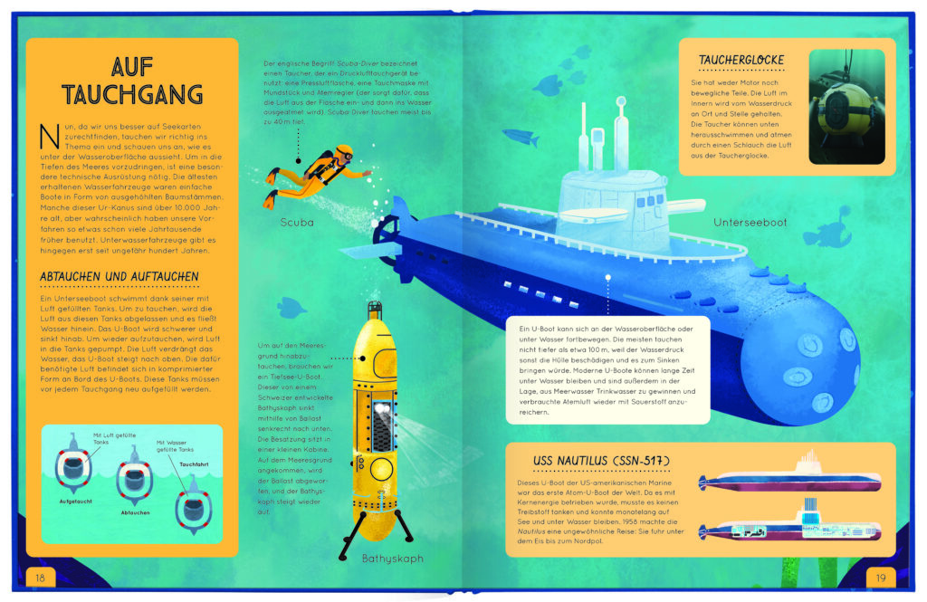 „Begib dich auf eine spannende Reise durch schäumende Meereswellen und an die tiefsten Stellen des Ozeans! Du segelst über die Weltmeere, tauchst mit dem U-Boot ab, erkundest den Ozeanboden, bestaunst farbenprächtige Korallenriffe und lernst die atemberaubende Vielfalt des Lebens im Meer kennen.