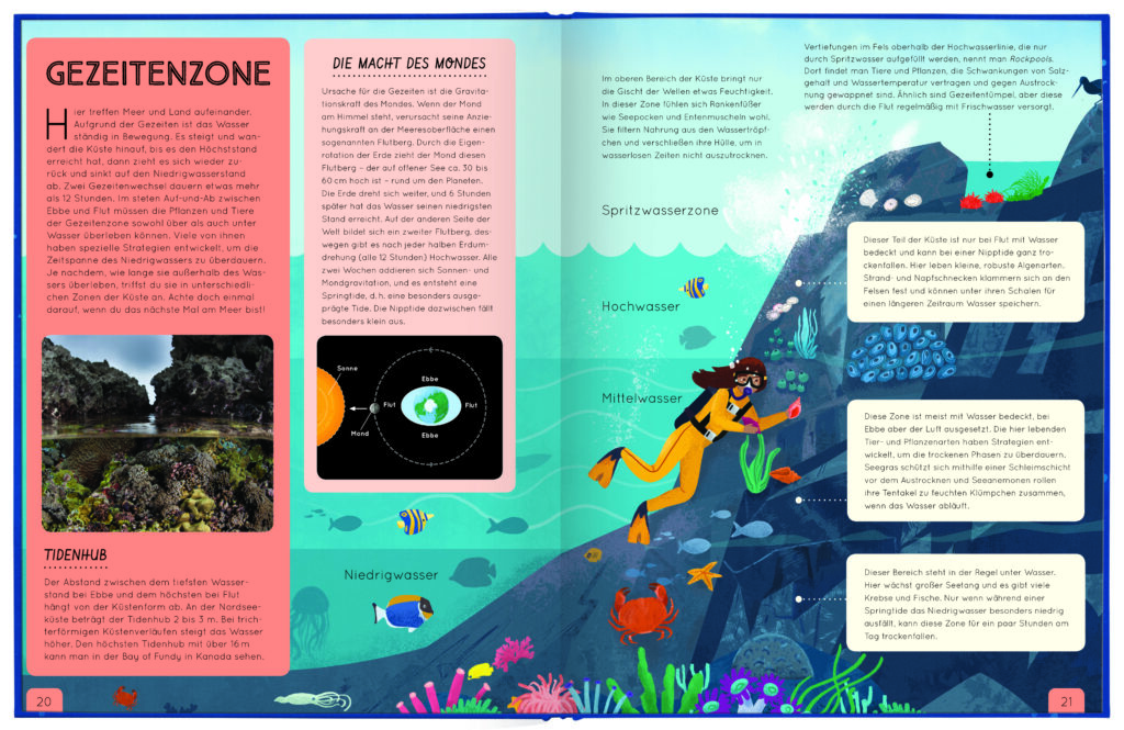 Ich hätte viel früher damit beginnen sollen, Kindersachbücher zu lesen. Hier wird einem auf leichte und angenehme Weise einiges an Wissen vermittelt, ohne dabei Langeweile aufkommen zu lassen oder zu trocken daher zu kommen. So auch in diesem Buch hier. Die einzelnen Textblöcke erzählen einem die wichtigsten Fakten zu der Vielfalt an Themen die das Meer umfassen. Da ist nichts langweilig oder anstrengend. Vielmehr hat man immer wieder Aha Effekte und ich war einfach begeistert, dass ich nach all meinen bisherigen Lektüren doch immer wieder neue Aspekte finden konnte. Dinge, die ich noch nicht wusste, oder auch Dinge, die mir entfallen waren.